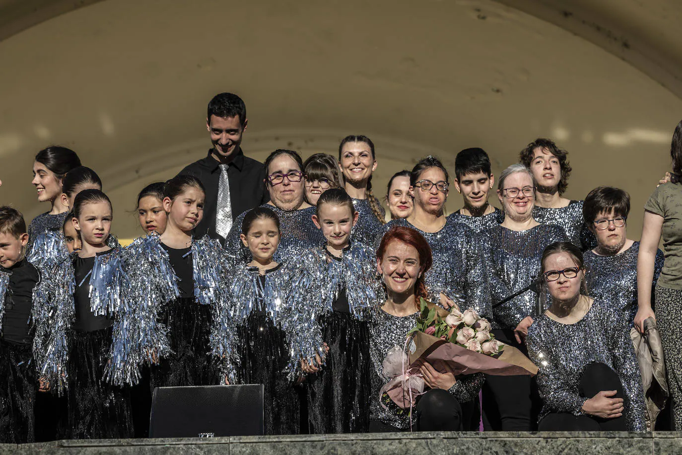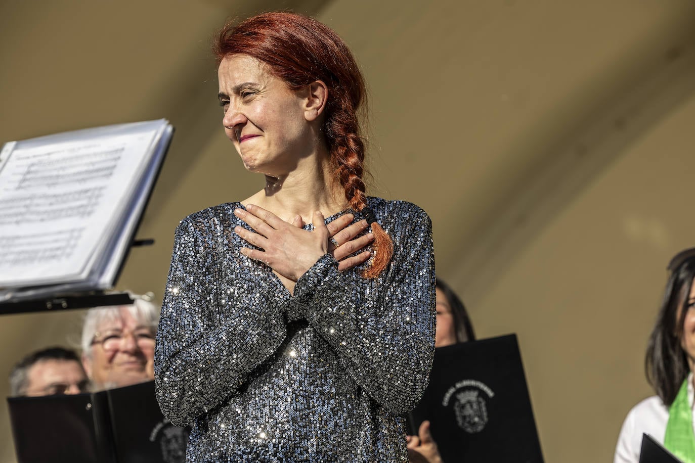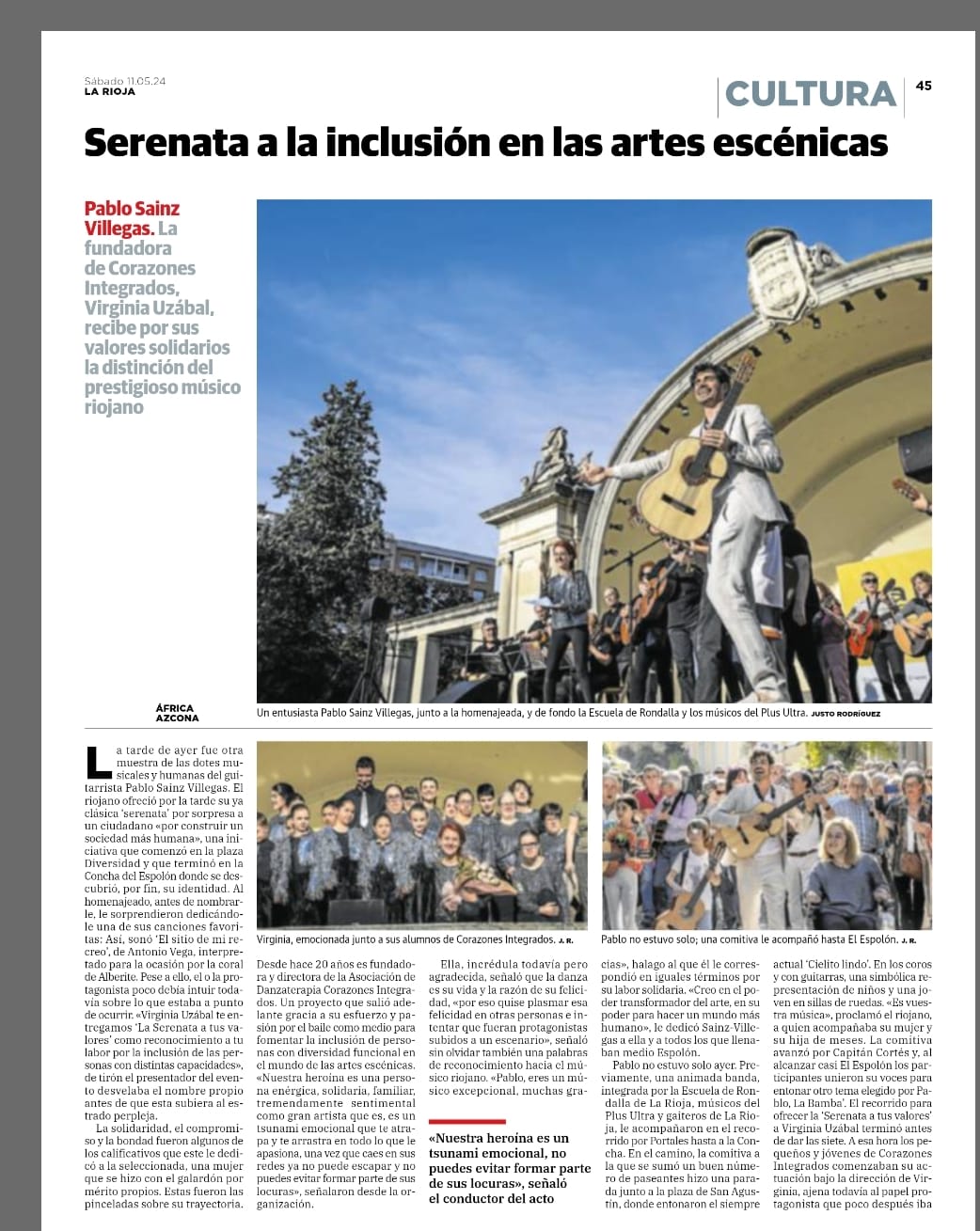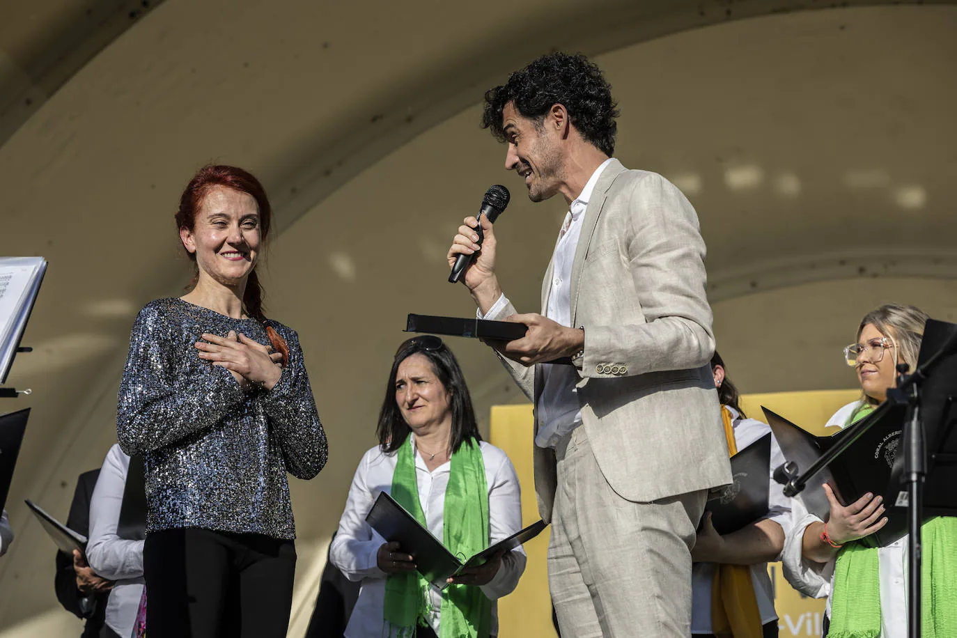 LOGROÑO, 10/05/2024.- a fundadora de la Asociación de Danzaterapia ?CorazonesIntegrados?, Virginia Uzabal (c), ha sido escogida como la heroína anónima de este año para recibir la ?Serenataa tus valores?en un concierto sorpresa de Sainz-Villegas en la víspera del inicio de La Rioja Festival, dirigido por este guitarrista, que arrancará el próximo día 17. EFE/ Raquel Manzanares