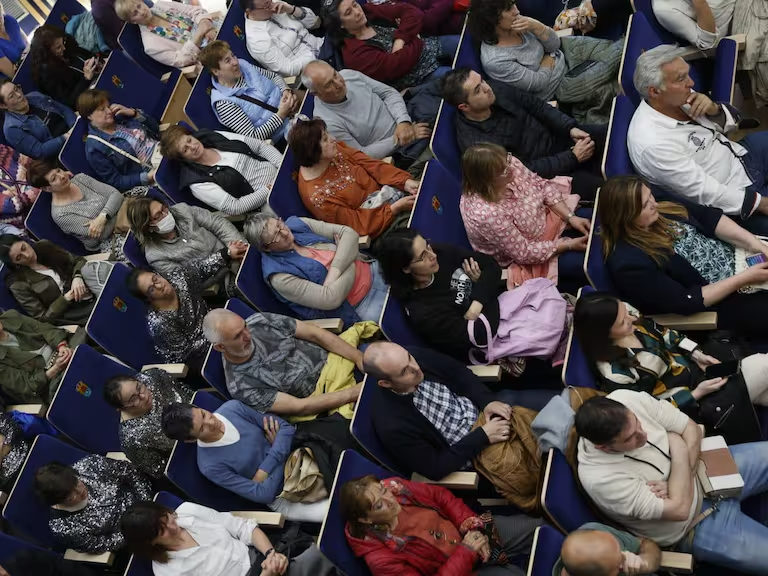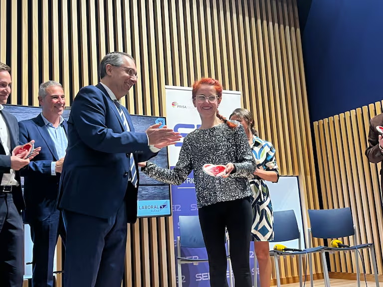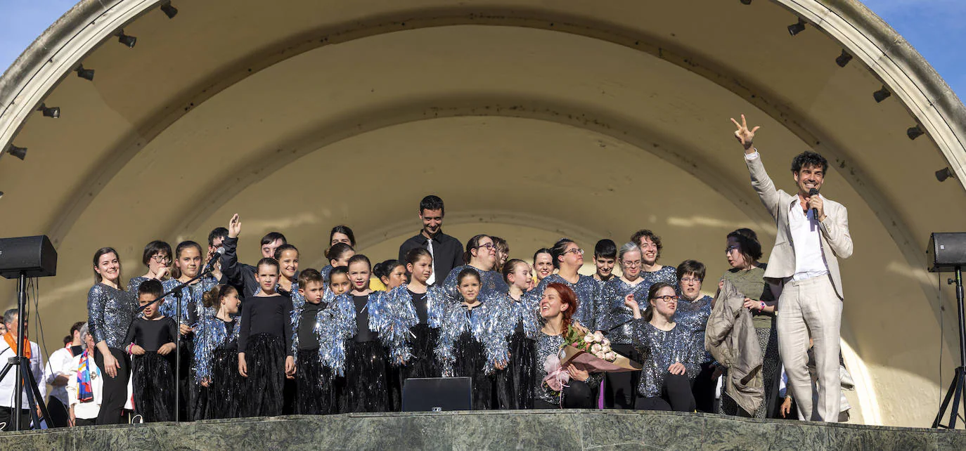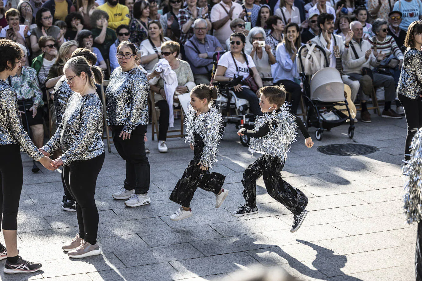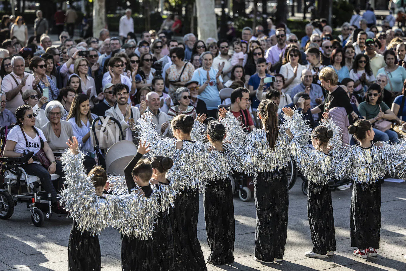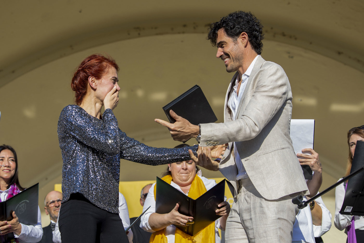 LOGROÑO, 10/05/2024.- a fundadora de la Asociación de Danzaterapia ?CorazonesIntegrados?, Virginia Uzabal (c), ha sido escogida como la heroína anónima de este año para recibir la ?Serenataa tus valores?en un concierto sorpresa de Sainz-Villegas en la víspera del inicio de La Rioja Festival, dirigido por este guitarrista, que arrancará el próximo día 17. EFE/ Raquel Manzanares