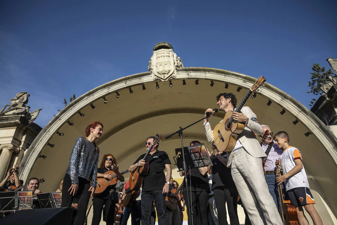 LOGROÑO, 10/05/2024.- El guitarrista riojano Pablo Sainz-Villegas (d) ha ofrecido este viernes su serenata por las calles de Logroño, en las que ha estado acompañado de más de un centenar de músicos y ciudadanos, a la fundadora de la Asociación de Danzaterapia Corazones Integrados, Virginia Uzabal (i). EFE/ Raquel Manzanares